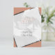 Theme Parties' minimalist modern casual wedding RSVP card design in terra cotta features your favourite engagement photo angled as a design element, giving your invitation modern geometric style. And your engagement picture is automatically converted to black and white and repeated on the reverse side. The design is accented with hand-lettered typography paired with modern block text. #MinimalistWedding #ModernWedding #PhotoInvitation #CasualWedding