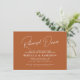 This simple wedding Rehearsal Dinner invitation features elegant script text on a terracotta coloured background.