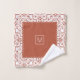 Terracotta and white damask pattern and scalloped borders Bath Towel Set. The bath towel features an elegant terracotta brown and white damask pattern and bands on the short sides with scalloped edges. There is also a frame with your family name. The hand towel showcases a scalloped border around it while the wash cloth is in terracotta colour in the centre with a damask border and your monogram. You can personalise it with your family name and monogram.