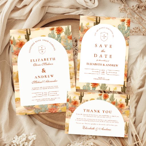 A refined western-inspired design featuring warm desert florals, cacti, and earthy botanicals arranged in a rich, painterly composition. The arched layout adds a timeless architectural feel, balancing the bold surrounding pattern with a clean, elegant center. Terracotta tones, soft neutrals, and muted greens create a grounded yet romantic palette—perfect for a modern desert or western celebration. Ideal for couples who want something unique, artistic, and effortlessly sophisticated.