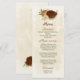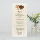 Beautiful earth tone fall wedding menu card featuring terracotta, beige and cream flowers with green leaves .