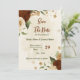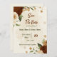 Beautiful earth tone fall wedding save the date invitation featuring terracotta, beige and cream flowers with green leaves .