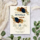 Beautiful earth tone fall birthday party invitations featuring terracotta, beige and navy blue flowers with green leaves .