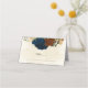 Beautiful earth tone fall wedding place card featuring terracotta, beige and navy blue flowers with green leaves .