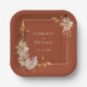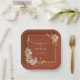 Terracotta Fall Paper Plate. Serve your celebration in style with these square paper plates, showcasing a stunning arrangement of hand-painted watercolor burnt orange and terracotta leaves, soft cream and beige dahlias, and rich copper and rust-coloured roses. The warm copper background adds a cosy, elegant touch, making these plates a beautiful and practical addition to your autumn wedding. Elevate your tablescape—customise your square plates now.
