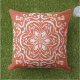 This pillow is very attractive. I ordered a number for patio/outdoor use. It is not an outdoor pillow but I was looking for this color and design. It actually is a hard fabric that feels more like an outside versus indoor pillow. Not sure how it will last outside but it is not in direct sun so hopefully won’t fade too much. It is true to its color - more on the orangey versus rusty side. Color is as shown. More Orange than rust.