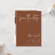 Modern terracotta colored save the date card featuring a modern calligraphy heading and the couples photo on the back along with some text. Ideal for a couple looking for a modern terracotta wedding save the date and like modern calligraphy text.