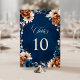 Elegant Navy blue, Terracotta , Orange earthy floral theme wedding table number card featuring elegant bouquet of Navy blue, Terracotta colour roses peonies and green eucalyptus leaves. Please contact me for any help in customisation or if you need any other product with this design.
