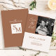 Elegant terracotta Save the Date card with personalised monogram and couple photo. Minimalist design with warm tones, perfect for modern or rustic weddings. Fully customisable and printed on premium cardstock.