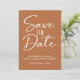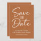 Wedding Save the Date card in a terracotta rust colour and minimalist design. This save-the-date invite has the chic look of trending wedding stationery with modern boho styling. It is designed to fit with your rustic or boho wedding theme or style. The clean handlettered typography and minimalist design will help spread the word about your fabulous spring or fall wedding. Customised with the names of the bride and groom, their wedding date, and location. The background colour of this card is also customisable and can be created to perfectly match your wedding colours.