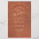 These wedding programs are elegant and tasteful, while still being budget friendly. The hand painted watercolor design features a sprig of leaves and marbled backgrounds in shades of terracotta, rust orange, and burnt umber. The typography features lacy script calligraphy, and there is room for details on the ceremony, the bridal party, and a short thank you. Perfect for a fall or autumn wedding.