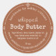 Terracotta Script Handmade Body Butter Label round sticker featuring a soft terracotta background with white script and serif typography. The design clearly presents your business name, product title, ingredients, and weight in a clean, easy-to-read format that feels both handmade and professional. Ideal for organic skincare jars, whipped body butter packaging, fall collections, gift sets, and small business branding. Easily personalize with your details.