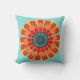 A fluffy flower in shades of terracotta, teal, red orange, dark brown and yellow orange.