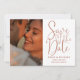 This terracotta elegant script wedding save the date invitation can be personalised with your 2 special photos and wedding day information and wedding website QR code. Designed by Thisisnotme©