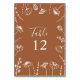 Terracotta Burnt Orange Wildflower Wedding Table Number Cards - with editable table number and simple linear floral design. Delicate botanical theme with wild flower frame in white line art and elegant handwritten script typography. Please browse my Wildflower Sketch collection for matching items.