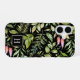 Chic botanical patterned case features watercolor greenery, fern foliage and tiny pink flowers on a dramatic black background. Personalise with a single initial monogram near the bottom in classic lettering.