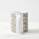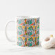 This mug has a mid-century modern design of triangles making a terrazzo floor look, in greys, turquoise, orange, gold, and green.