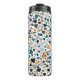 A terrazzo style design featuring random shapes in a range of sizes and colours.