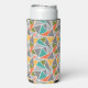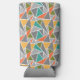 This seltzer can cooler has a mid-century modern design of triangles making a terrazzo floor look, in greys, turquoise, orange, gold, and green.