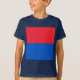 100% cotton so perfect for summer, It is a nicely designed t-shirt, the fabric is soft and the seams finished well, the body of the t shirt has no side seams. I bought a medium size for my two grandsons, aged 9 and 8 it will be slightly big on them but I would rather that than too small