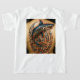 Medium shot capturing the torso of the model, focusing on the T-shirt design.