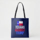 Anti Trump people who live in Texas. If you are a democrat Texan against Donald Trump for president, show it with this red, white, and blue Texas flag tote bag that reads Texans Against Trump.
