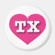 This magnet features a vibrant hot pink heart containing the bold, white, upper case letters TX, the official abbreviation for Texas, the lone star state.
