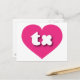 This postcard features a vibrant hot pink heart containing the bold, white, rounded, lower case letters tx, a playful abbreviation for Texas, the lone star state. The reverse side of the postcard is blank, awaiting your personalised text or handwritten sentiments.