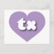 This postcard features a lavender heart containing the bold, white, rounded lower case letters tx, a playful abbreviation for Texas, the lone star state. The reverse side of the postcard is blank, awaiting your personalised text or handwritten sentiments.