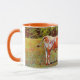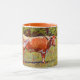 This pretty mug features my original photograph of a beautiful and big Texas Longhorn cow, standing in a farm pasture, processed in an illustrated and painterly technique for an artsy style. The handle and inside of the cup are an orange tone to complement the artwork.