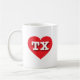 This mug features a vibrant red heart containing the bold, white, upper case letters TX, the official abbreviation for Texas, the lone star state.
