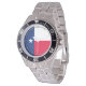 Has heft and feel of expensive stainless steel quartz watches. Good band with safety catch. I removed links, which is easy because engraved arrows show direction to push the linking pins. As always by this seller, the image (a railroad logo) is a perfect reproduction of my emailed image, and is precisely spaced and aligned.