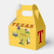 Outline of Texas with icons related to Texas,bird,alamo,"longhorn steer",flower,gold done on a gold background
