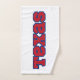 This custom hand towel features a design that displays the word "Texas" in a Sports World print font with red letters blue outline in this custom state pride style and theme. This towel is made with a polyester blend front while the back is 100% cotton all towels will use sublimation/vibrant printing which is designed to last.