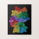 A typographic text map of Germany, created from the names of German regions. Multi-coloured text on a black background.