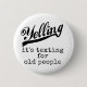 This funny button says "Yelling: it's texting for old people." When young people want to talk to somebody across a room, they text. But old people simply yell.