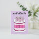 A fun cartoon of a pink and white cake, iced and covered in lit candles. The image has a pale mauve background and is accompanied by the words 'Happy Birthday' in Thai.