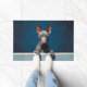 The deep indigo blue background adds a bold and modern touch, perfect for stylish entryways. Designed with extra space at the top and bottom, it allows easy personalisation with names, welcome messages, or custom text—making it ideal for unique dog-themed doormats and thoughtful gifts.