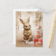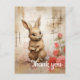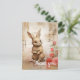 A cute rabbit stands on its hind legs amidst a backdrop of abstract splashes and drips, with a gentle expression on its face. Beside the bunny, a group of pink roses adds a splash of colour to the sepia-toned environment.