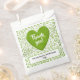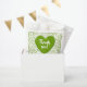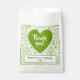 The over-the-hill, numerical design on the front has a green and white random number pattern with the green number 40 repeated in varied sizes and angles. There is a green puffy heart shape in the centre, front with "Thank you.” The lower front has room for, "Thank you for coming to my birthday party. A fun idea for party favours for your 40th birthday party, and for all occasions or celebrations where you are featuring the number forty; just change the text to match the event.