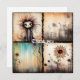 A whimsical character with wild hair and big eyes occupies the top left square, hinting at a Tim Burton-esque aesthetic. The top right square features gothic architecture with a desolate, possibly post-apocalyptic vibe, while the bottom squares display stylised, vibrant flowers against an ethereal backdrop.