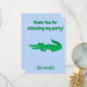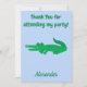 A cute thank you announcement, this item features a blue background and a green alligator. It reads "Thank You for attending my birthday party" fun green font with your name at the bottom in green. Order yours today!
