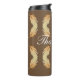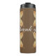 This thermal tumbler features a unique feather pattern in deep, rich, autumn colours. The feathers display colours of yellow and light brown against a dark brown background. The curve words "thank you" appear in the centre of this graphic design and can be customised to suit your needs.