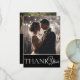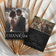 A minimalist yet elegant wedding thank you card is the perfect way to express your love and heartfelt thanks. With crisp white typography on a sleek black background, contrasting elegant fonts add a stylish, contemporary twist to the sophisticated design aesthetic. Easily customise it by adding two of your favourite cherished photos and a personal heartfelt message. This versatile card is perfect for all wedding themes, from elegant and classic to boho, rustic, and romantic, ensuring a timeless appeal.