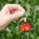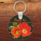 Cactus flowers are in full bloom on this southwest appreciation keychain. The nature photo captures large bright red orange flowers along with the green cactus pads and large flower buds. "Thank You" appears in bright orange font against a dark green background at the top of this round thank you keychain.