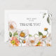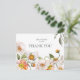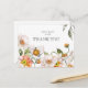 This elegant thank you card features a charming floral design with soft watercolor flowers in hues of peach, pink, and white, along with delicate green leaves. The flowers are placed at the bottom of the card, providing a beautiful frame for the words “THANK YOU” printed in a classic serif font. Above the message, there's space for personalised details like the couple's names and event date. Perfect for weddings, bridal showers, or any special event, this card blends timeless sophistication with a natural, botanical aesthetic.