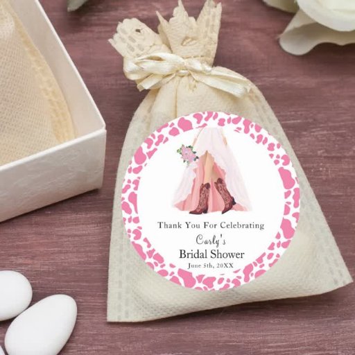 Stylish Thank You for Celebrating stickers! Featuring a modern bride in a sleek wedding dress, playfully showing off her cowboy boots while holding a bouquet of roses and hydrangeas, these stickers are the perfect blend of elegance and country flair. The background showcases a stylish pink cow print.