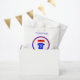 A fun and colourful 7th birthday party favour bag ready for your customised text. The circular design features a large red birthday banner with the message "HAPPY BIRTHDAY". Underneath, is a blue and red sports top, with a large white number 7 and space for the birthday child's name. Additional editable text in blue, top and bottom on the bag, reads "THANK YOU" "for coming to my party".