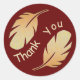 This appreciation sticker features a feather design in pale yellow and brown tones against a deep red background. The round sticker displays two feathers the curve around the edge of the sticker. The words "thank you" appear in the centre and curve their way between the feathers. This is a beautiful earth tone thank you sticker that is inexpensive to keep on hand for multi-purpose use. Both the background colour and "Thank you" can easily be customised if you desire.