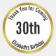 Thank you for coming is above the age of the birthday person (Shown: 30th). Additional text for a custom message is at the bottom (shown: Elizabeth's Birthday). All text can be edited or deleted. These elegant stickers have black text on a white background. The faux (not foil) gold border is an artistic rendering.
